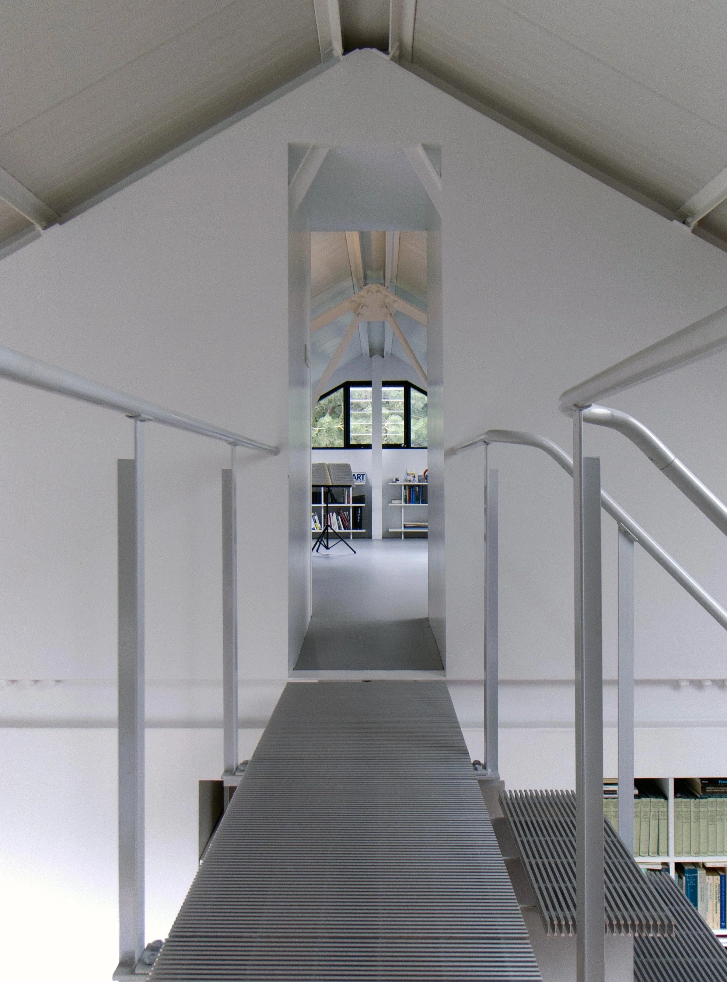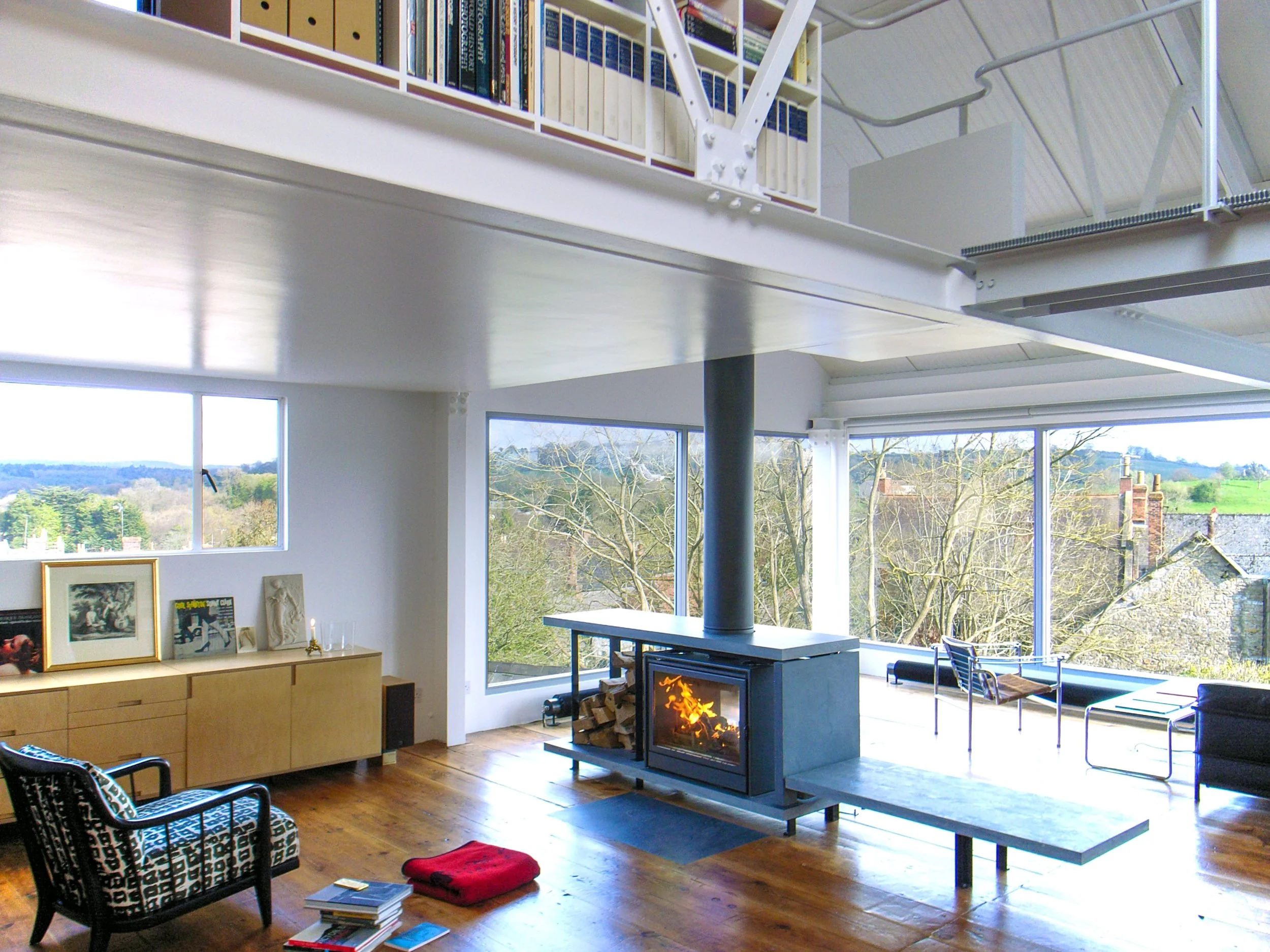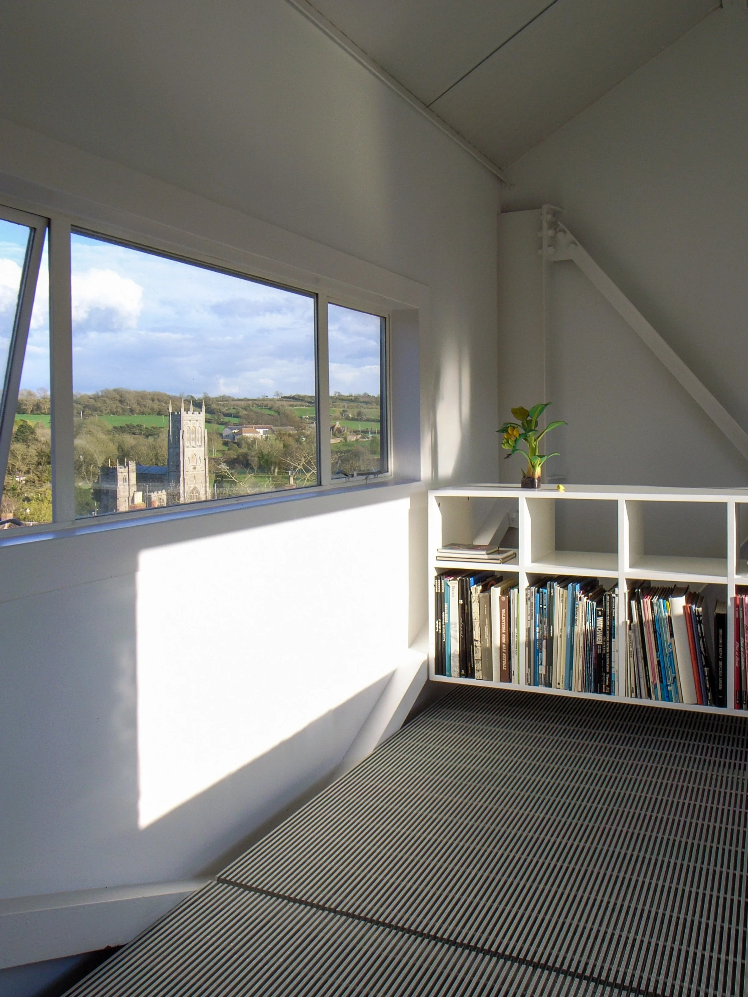 Upon entrance, a book lined passageway leads to expansive California Case Study House-like space; an observatory for views of the town and bucolic English landscape. The position of the fireplace organises different use of the main room. In concept, the fireplace is like a Claude glass, both a frame and reflecting surface, which offers a particular view over the town. The frame within a frame character of passageways, bridge landings, and house rooms, present pictures of the ever-changing landscape outside.