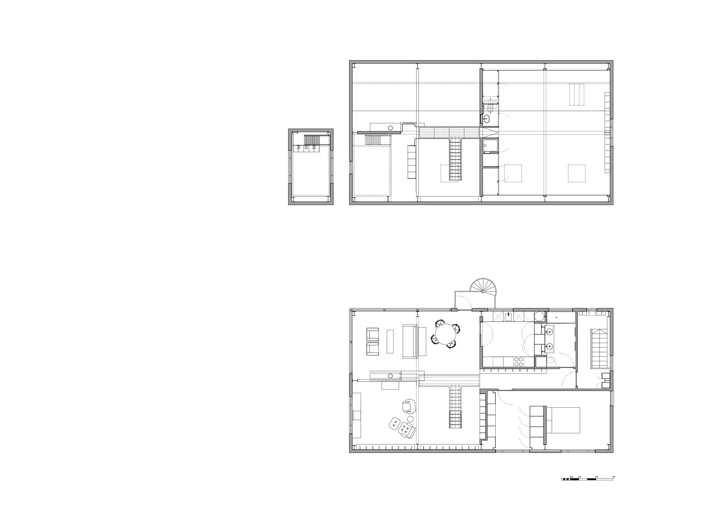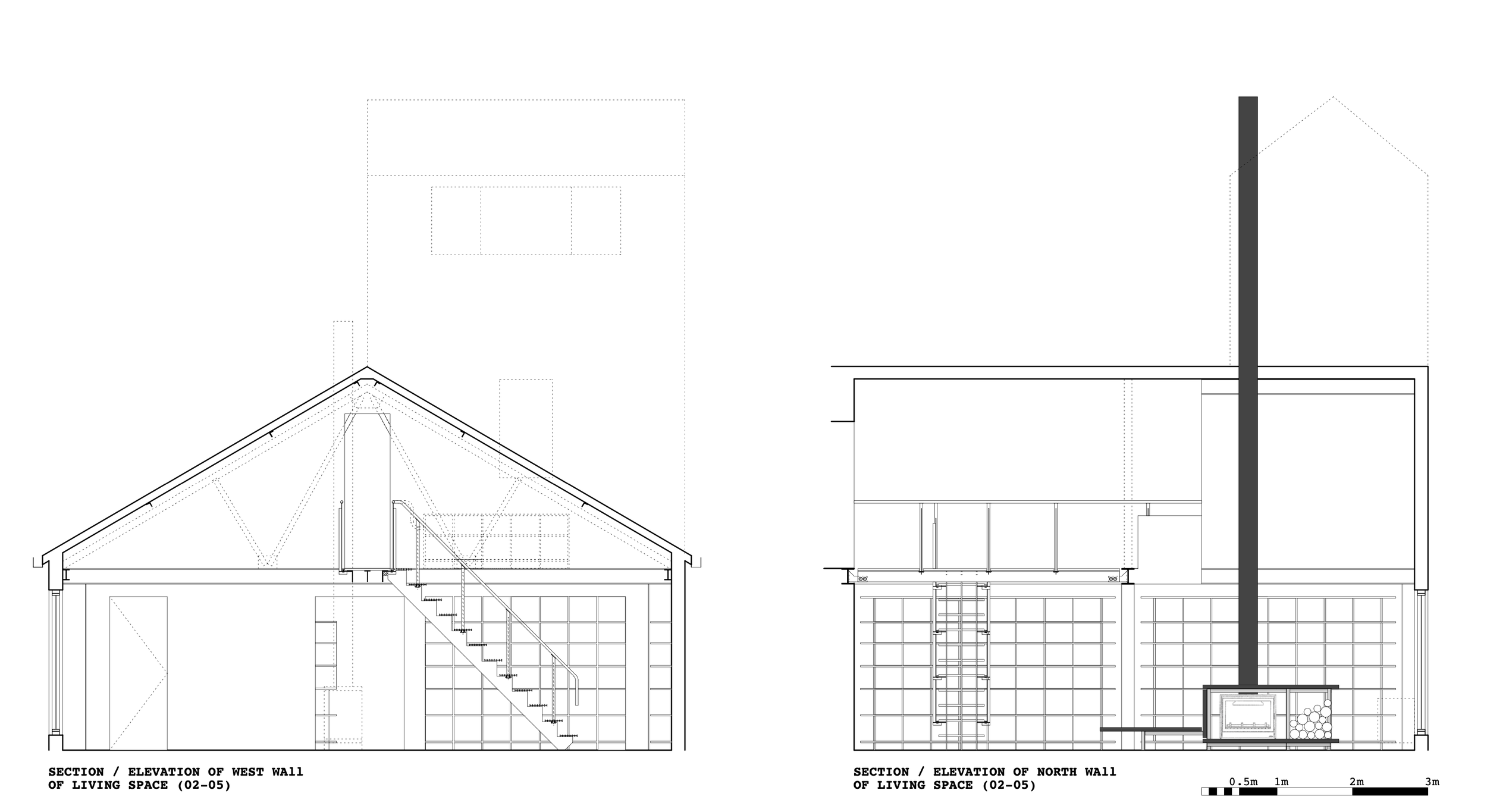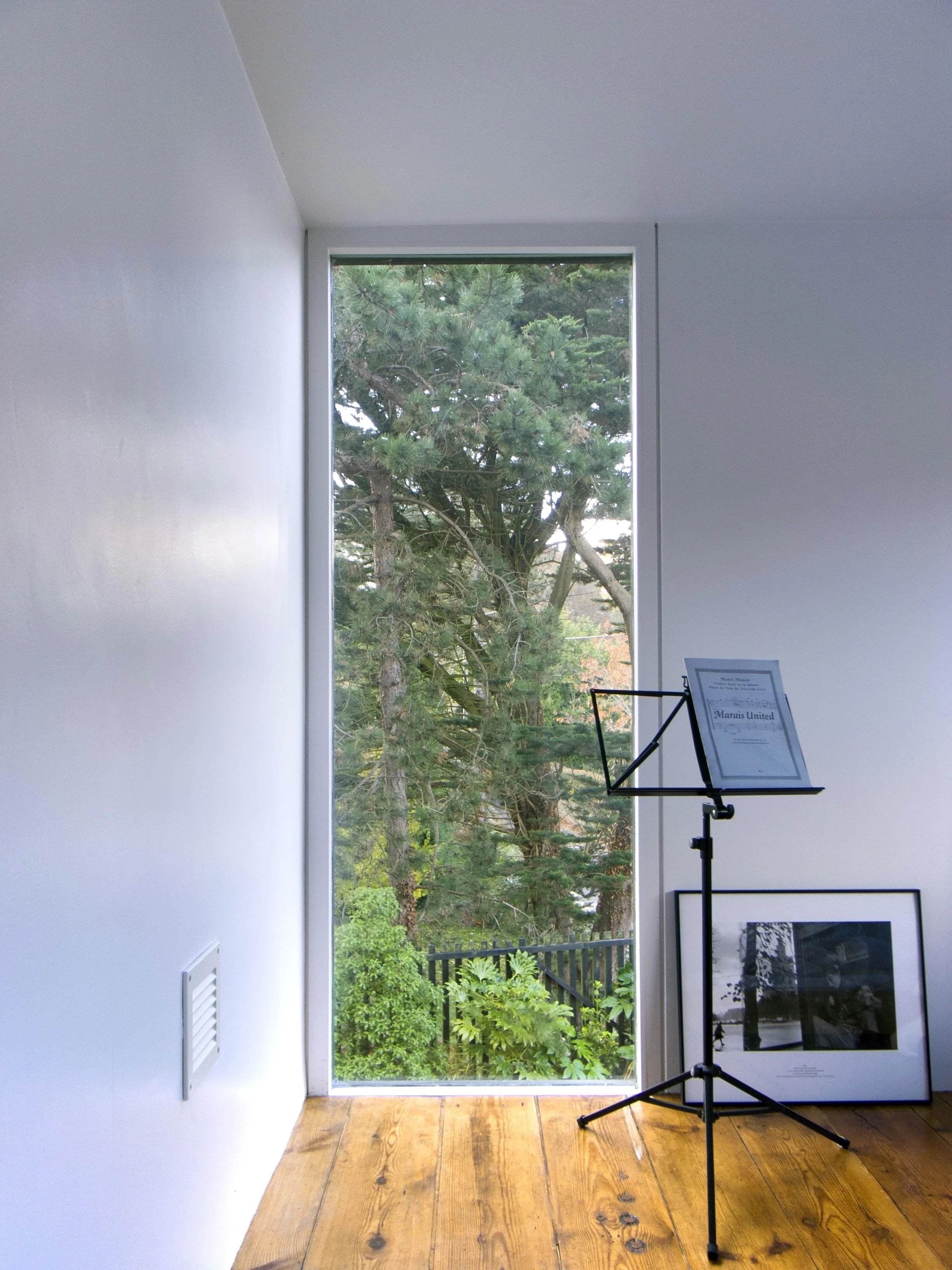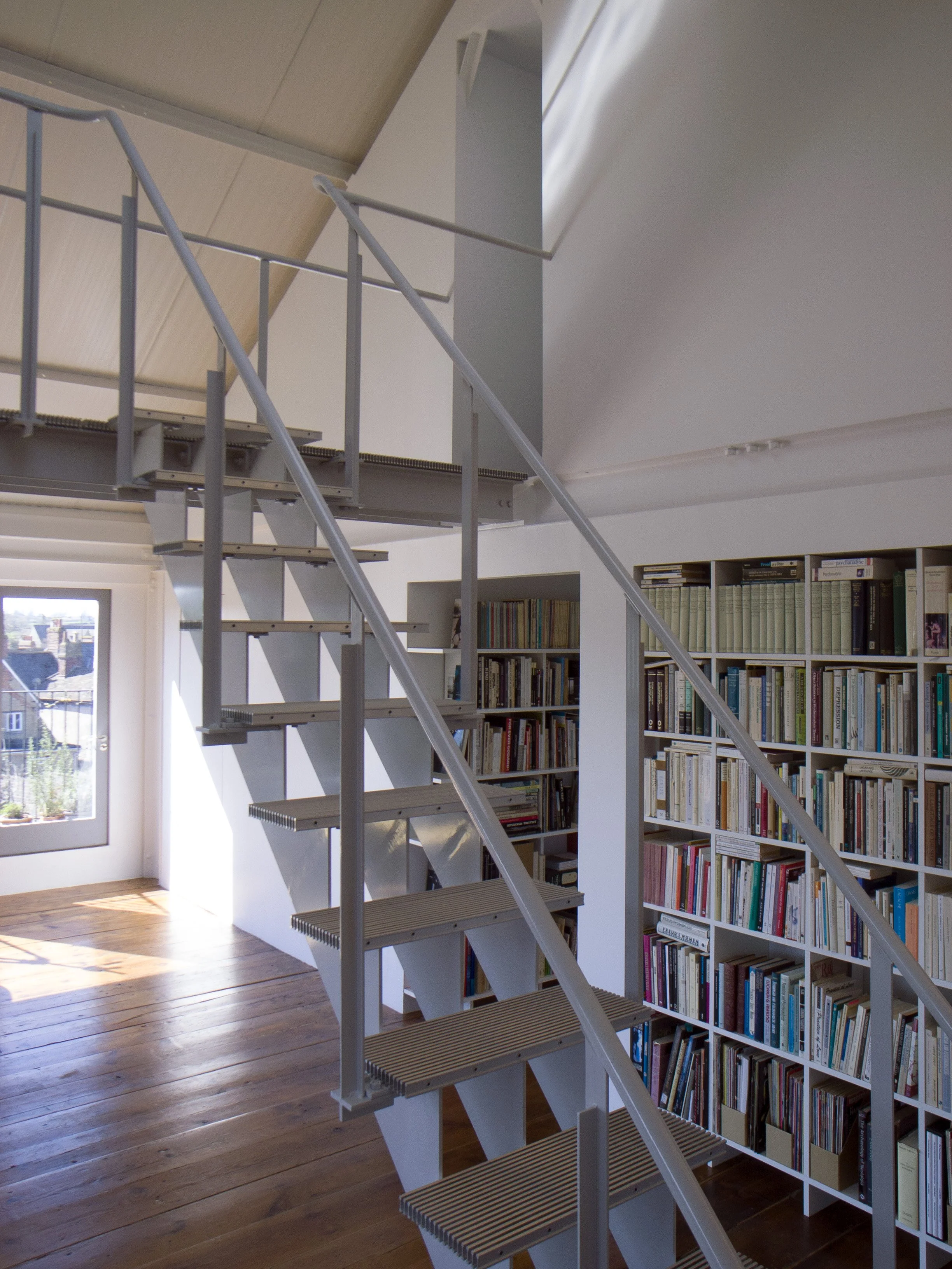 Upon entrance, a book lined passageway leads to expansive California Case Study House-like space; an observatory for views of the town and bucolic English landscape. The position of the fireplace organises different use of the main room. In concept, the fireplace is like a Claude glass, both a frame and reflecting surface, which offers a particular view over the town. The frame within a frame character of passageways, bridge landings, and house rooms, present pictures of the ever-changing landscape outside.